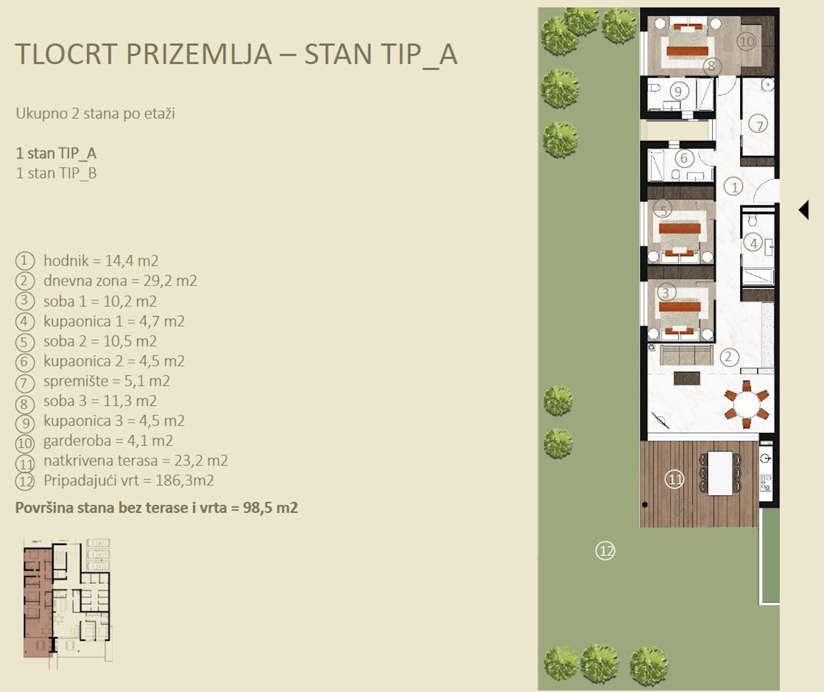 Stan 1B u Novigradu ima ukupno 98,5 m2 bez terase + 186 m2 vrta, nalazi se u prizemlju, faza gradnje, udaljen je 5 min. (1000m) od mora i od prekrasne uređene plaže, 5 min. (1000m) udaljeni ste od centra grada Novigrada. Stan se sastoji od kuhinje/dnevnog