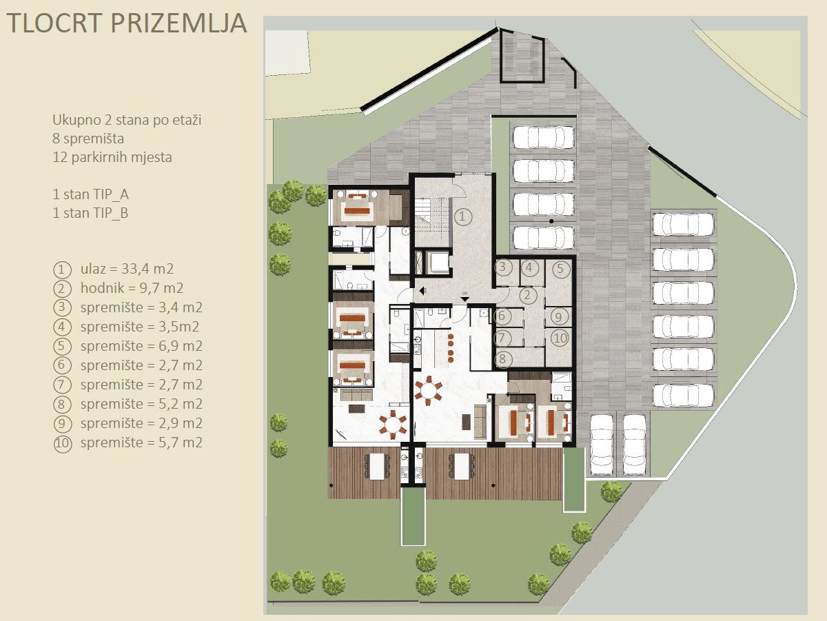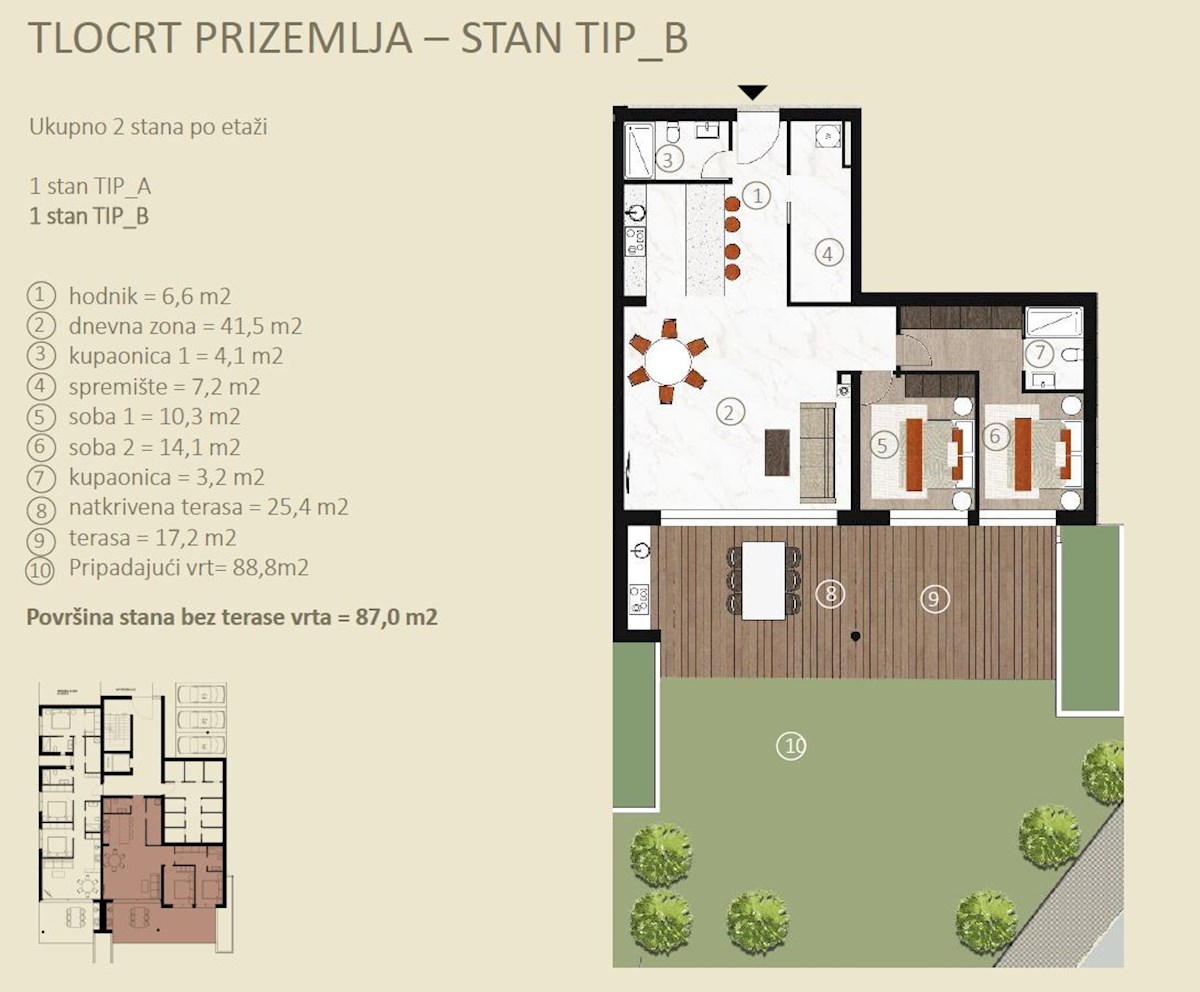 Stan 2B u Novigradu ima ukupno 87 m2 bez terase + 88 m2 vrta, nalazi se u prizemlju, faza gradnje, udaljen je 5 min. (1000m) od mora i od prekrasne uređene plaže, 5 min. (1000m) udaljeni ste od centra grada Novigrada. Stan se sastoji od kuhinje/dnevnog bo