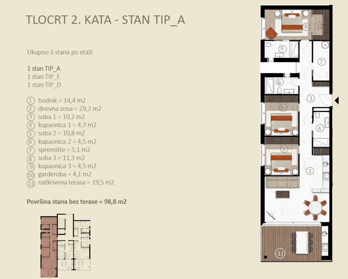Stan 6B u Novigradu ima ukupno 98,8 m2 bez terase, nalazi se na drugom katu, faza gradnje, udaljen je 5 min. (1000m) od mora i od prekrasne uređene plaže, 5 min. (1000m) udaljeni ste od centra grada Novigrada. Stan se sastoji od kuhinje/dnevnog boravka/bl