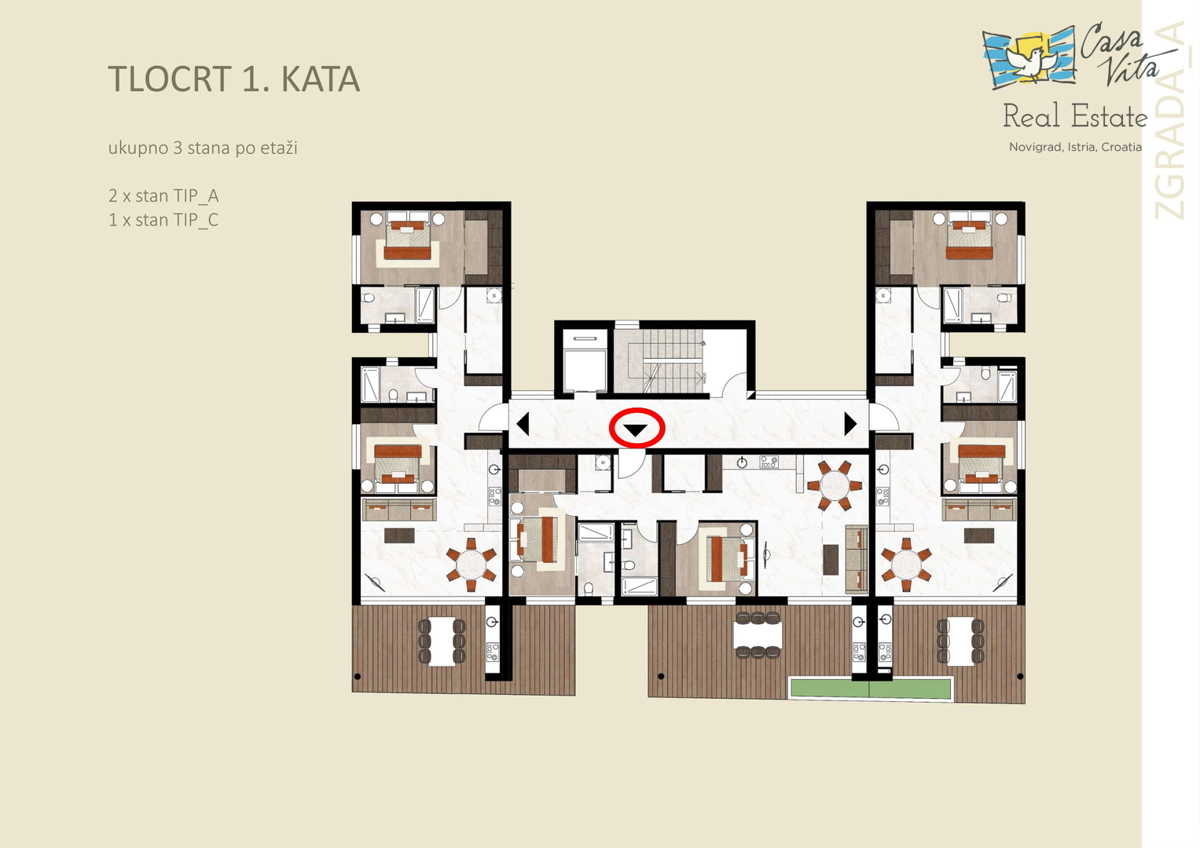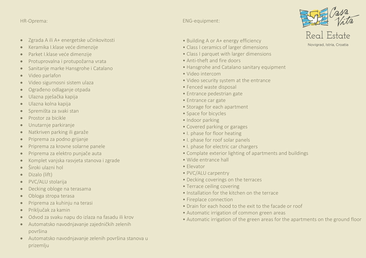 Istra, Novigrad U Novigradu, na samo 1km od centra grada i lijepih plaža, u izgradnji su 2 stambena objekta sa po 8 stanova svaki. Građenje je započelo početkom ožujka 2024.g., a predviđeni rok za završetak građenja je svibanj 2025.g. Zgrade su skladne,