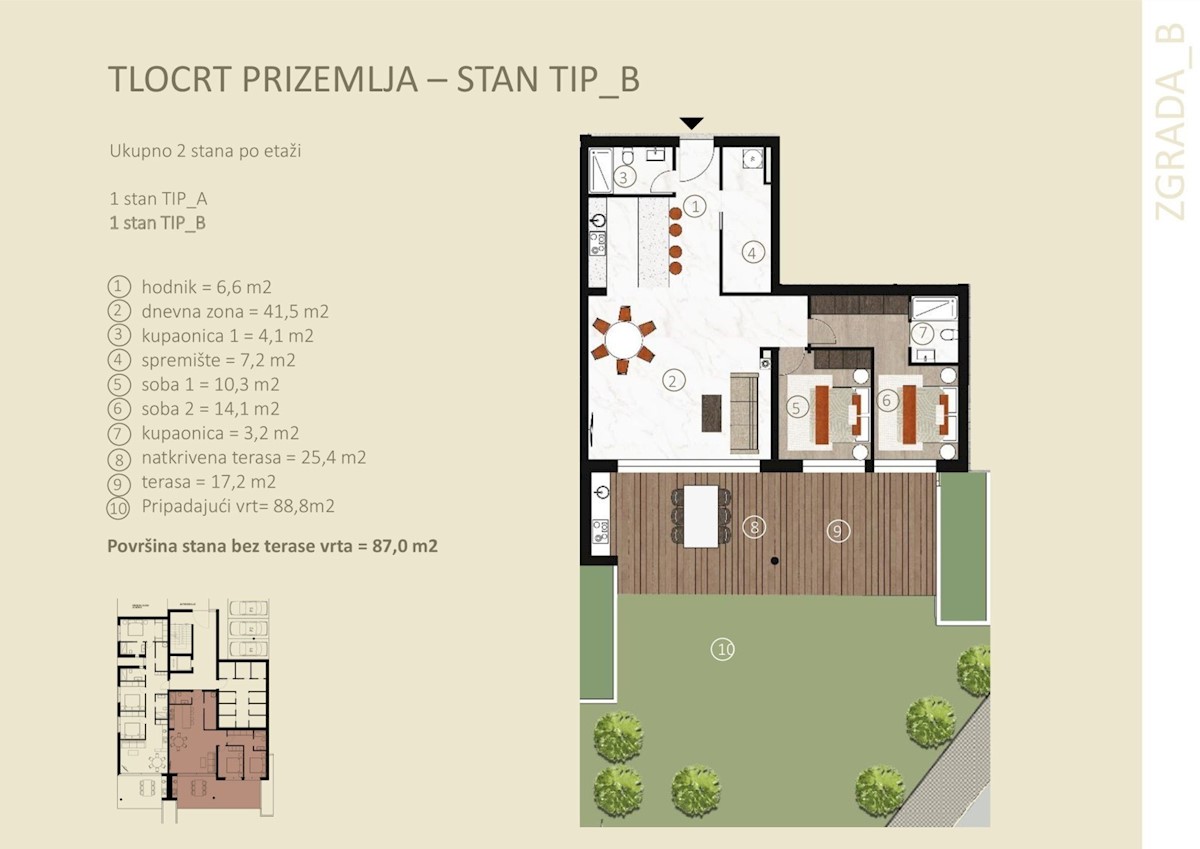 Doživite eleganciju i udobnost ovog lijepo dizajniranog stana u prizemlju koji se nalazi u luksuznoj zgradi. S ukupnom površinom od 117 m2 i vrtom od 88,80 m2, ovaj stan je ostvarenje snova. Zakoračite unutra i otkrijte prostranu tlocrtnu površinu od 87