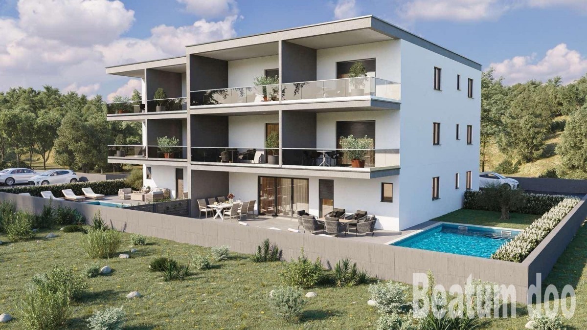 Stambena zgrada u Novigradu u izgradnji , sa 8 luksuznih stanova , dva trosobna stana u prizemlju sa vrtom i bazenom, po tri stana na prvom i tri stana na drugom katu . Miran dio naselja sa pogledom na more sa gornjeg kata, od opreme : kvalitetna gradnj