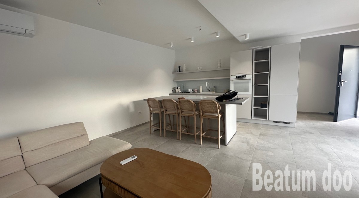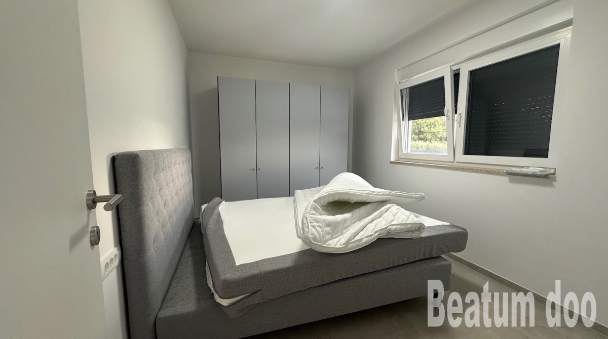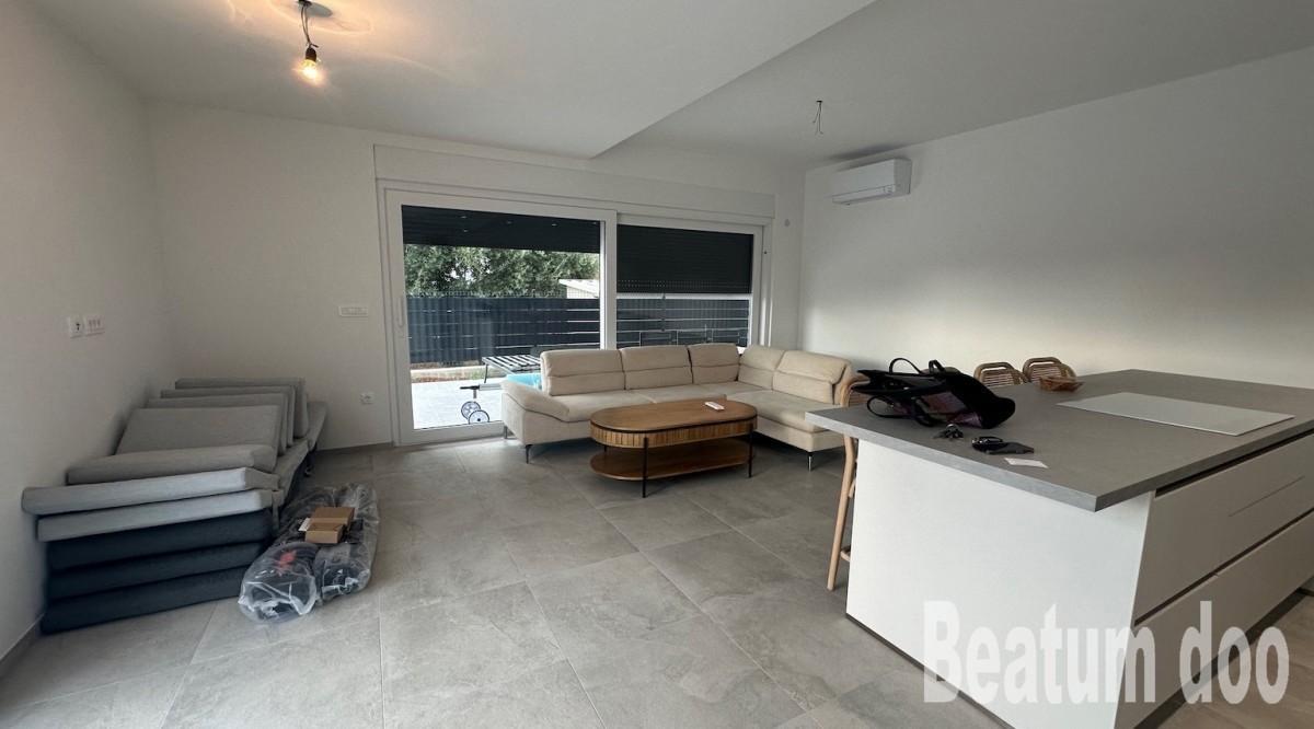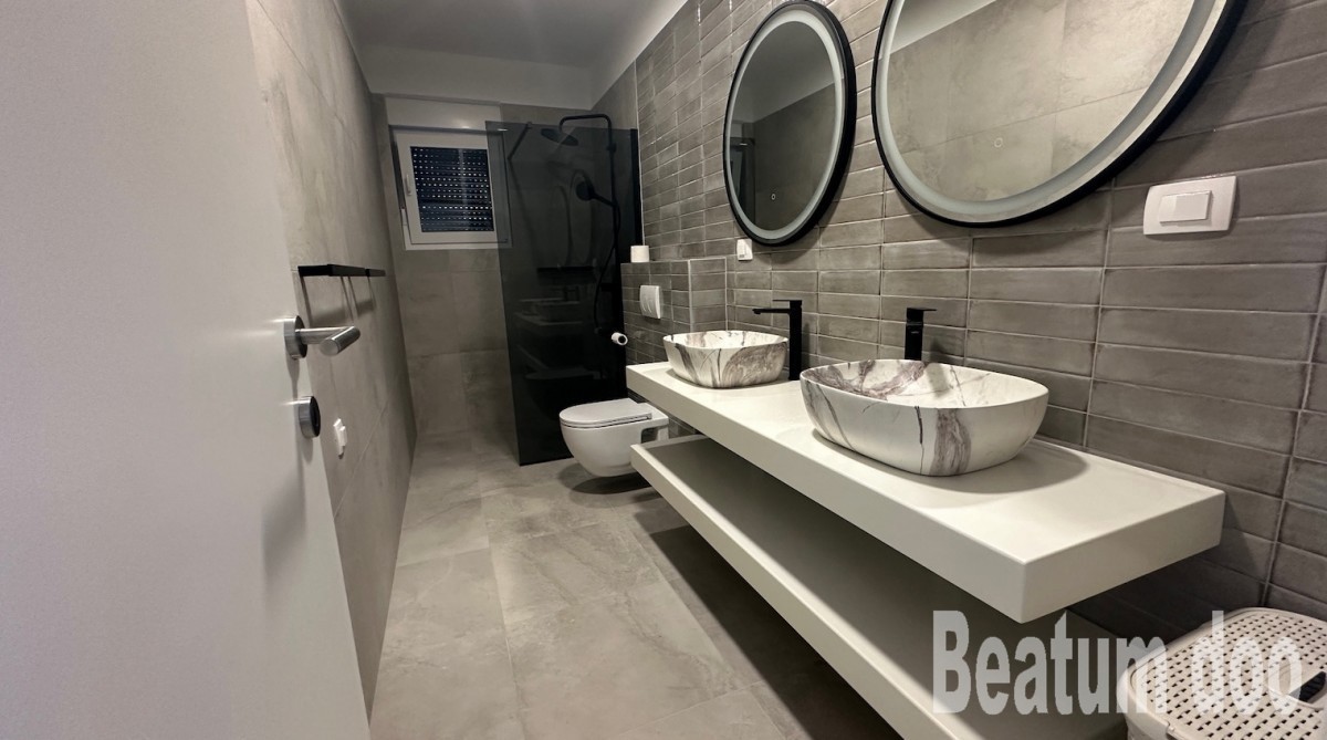 Stan u prizemlju sa bazenom i pogledom na more Tri spavaće sobe,dva kupatila,ostava,dnevni boravak,kuhnja,blagovaona Stan ima podno grijanje i u svakoj sobi klima uređaj Stan je namješten sa kvalitetnim namještajem Parking mjesto