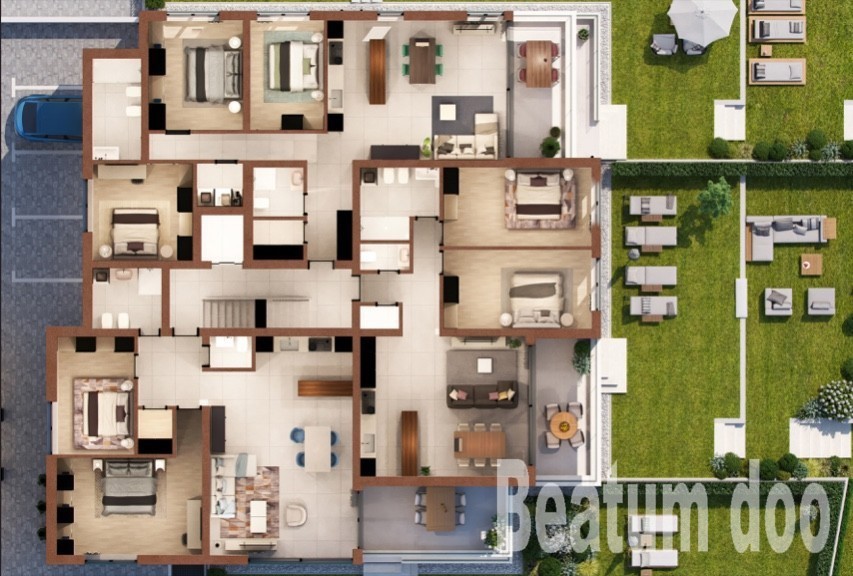 Stan S2 u prizemlju,pogled na more Dvije spavaće sobe,jedno kupatilo,jedan wc,kuhinja,blagovaona,dnevni boravak,spremište,terasa,vrt Parking mjesto