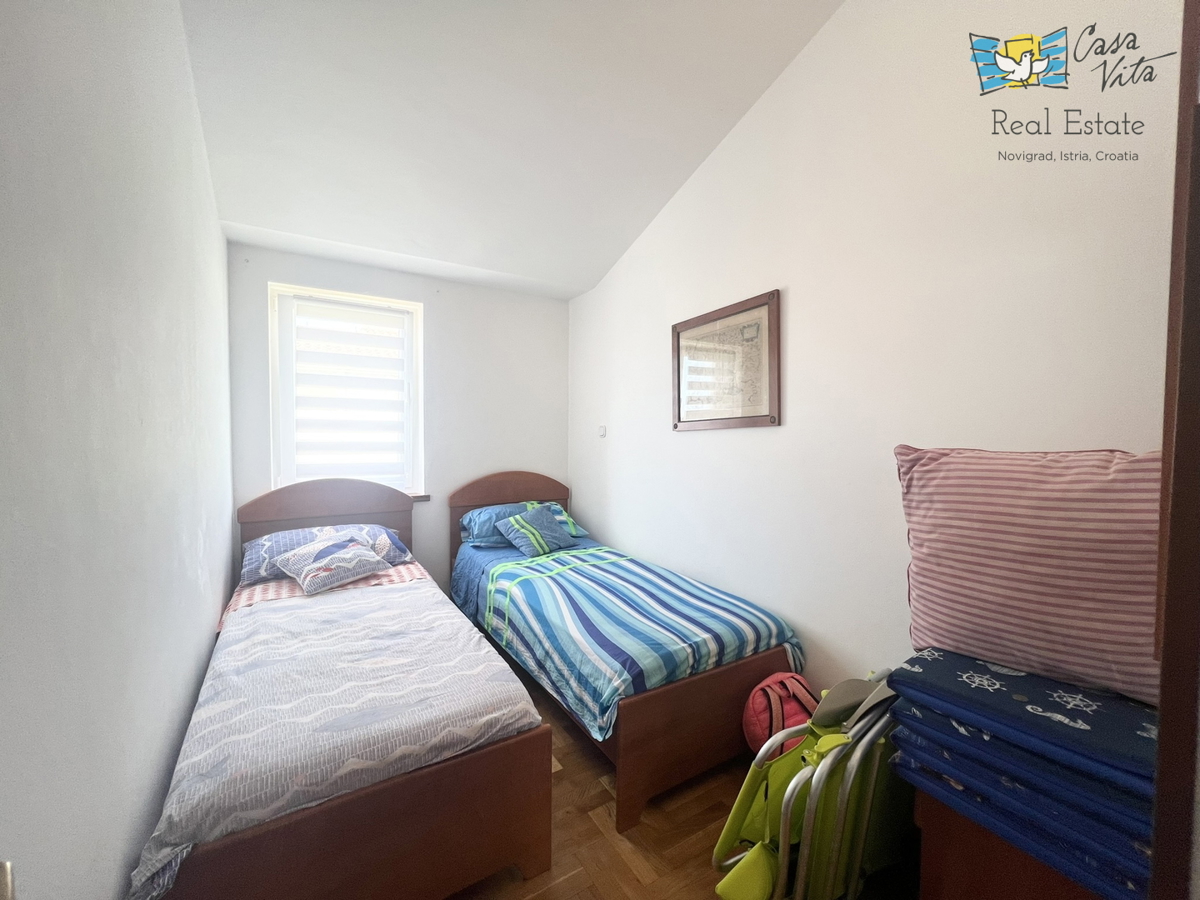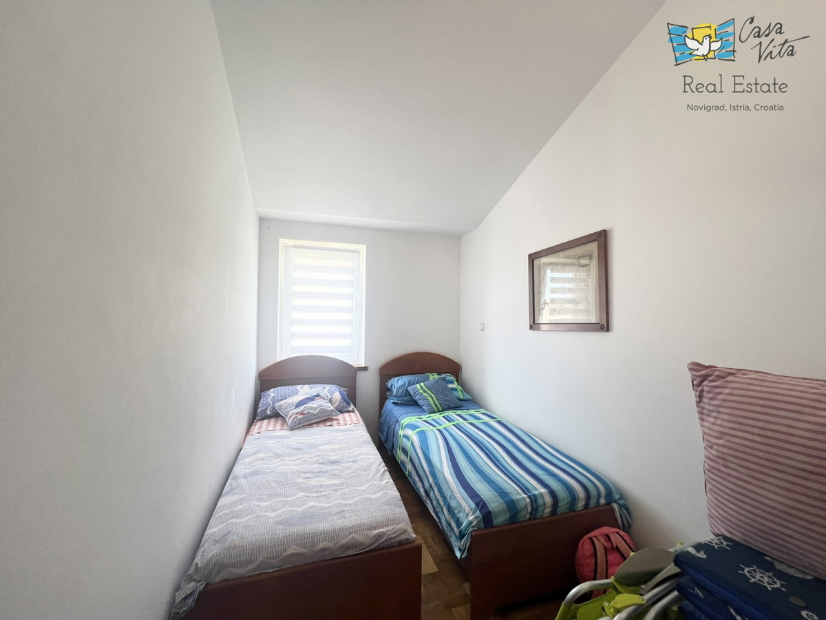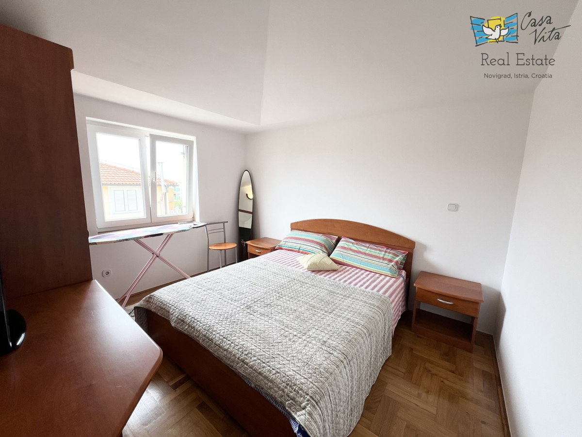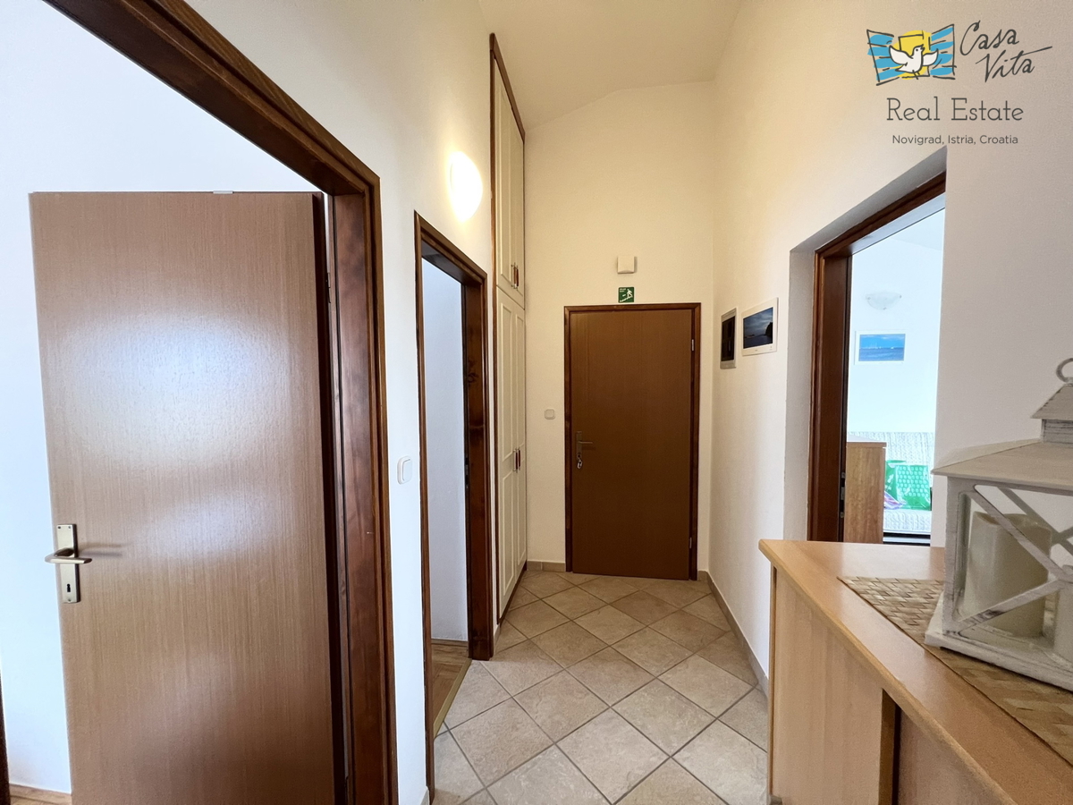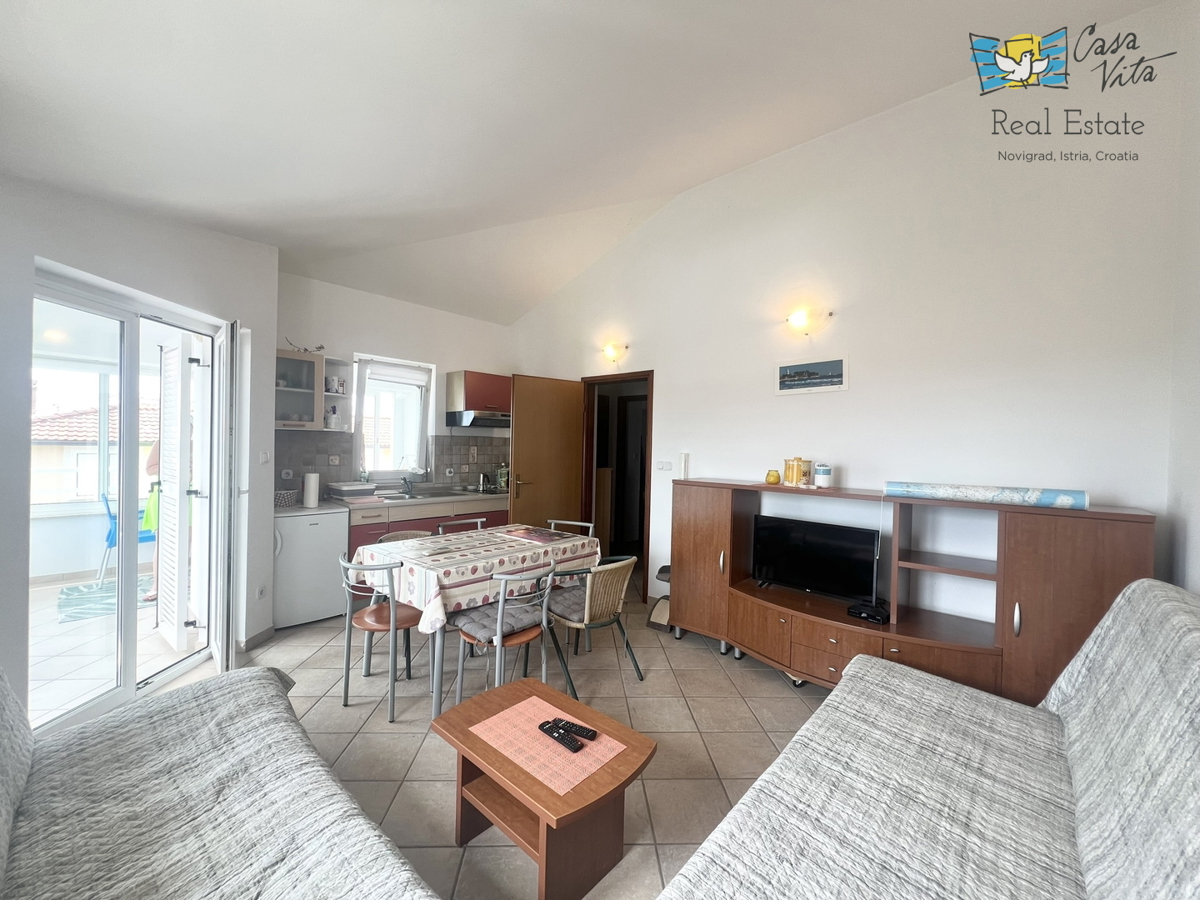 Istra, Novigrad Prodaje se stan na drugom katu stambene zgrade s čarobnim pogledom na more. Stan ima 50 m² i savršeno je iskorišten te se sastoji od dvije udobne spavaće sobe, kupaonice, prostranog dnevnog boravka s kuhinjom i blagovaonicom. Iz dnev