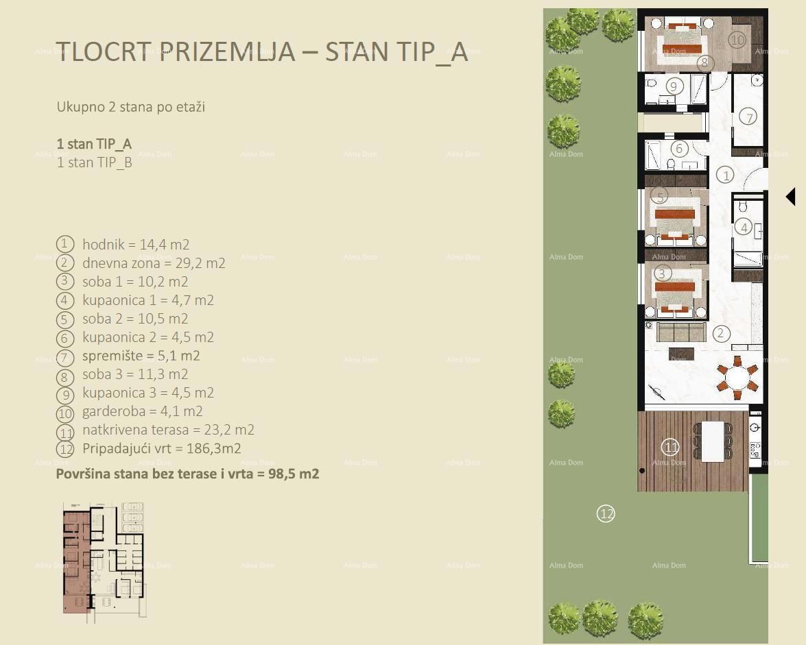 Prodaja apartmana u novom stambenom kompleksu u Novigradu! Kompleks se sastoji od dvije stambene jedinice, ukupno 14 stanova. Ovaj lijepi stan Tip A , nalazi se u prizemlju zgrade B i sastoji od ulaza, prostranog dnevnog boravka, kuhinje i blagovaonice