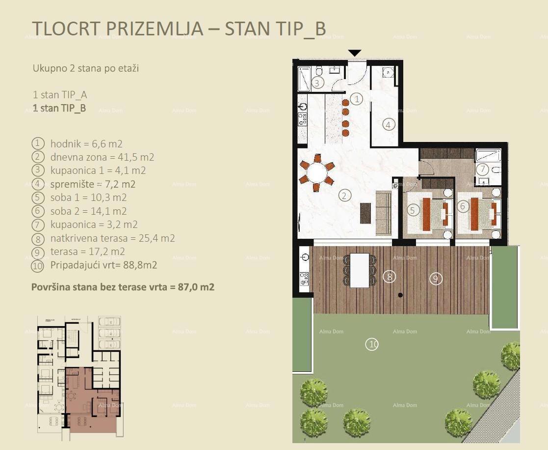 Prodaja apartmana u novom stambenom projektu u Novigradu! Kompleks se sastoji od dvije stambene jedinice, ukupno 14 stanova. Ovaj lijepi stan Tip B , nalazi se u prizemlju zgrade B i sastoji od ulaza, prostranog dnevnog boravka, kuhinje i blagovaonice