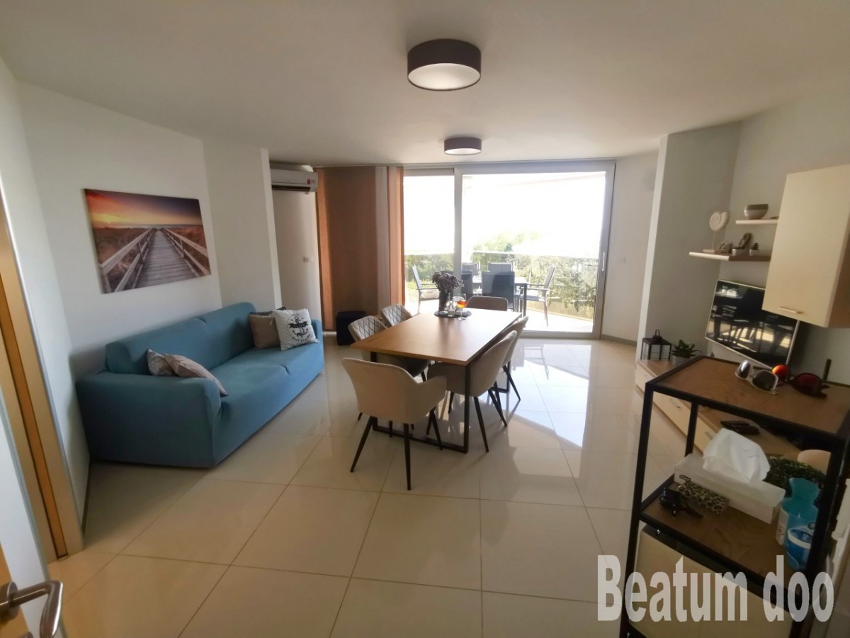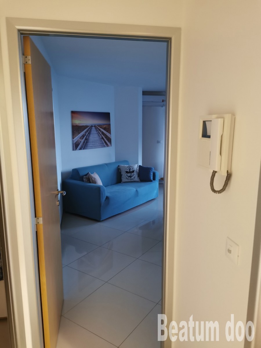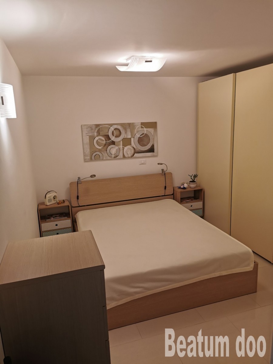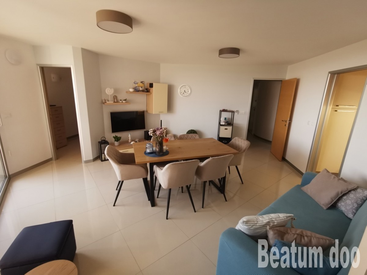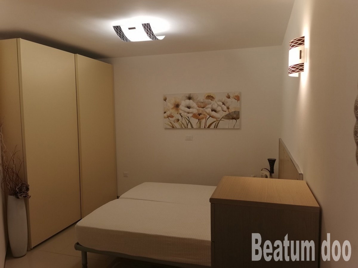 Stan na prvom katu sa pogledom na grad i more Dvije spavaće sobe,jedno kupatilo,dnevni boravak,kuhinja,kompletno namješten sa kvalitetnim namještajem,podno grijanje,zgrada ima lift. Garaža