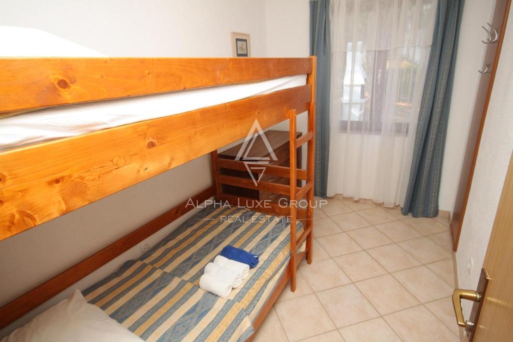 Smješten u šarmantnom kompleksu u blizini Novigrada, ovaj stan na prvom katu nudi udoban i funkcionalno dizajniran životni prostor samo 100 metara od plaže. Površine 46m², stan ima privatni ulaz, prostrani dnevni boravak i dvije dobro opremljene spavaće s